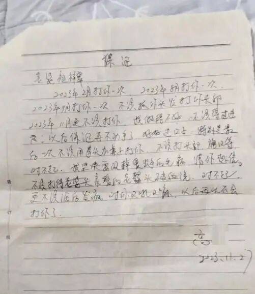 媒体报道中,高某曾在他人见证下写下了多份保证书,2023年11月的一份保证书中写道:“2023年2月打你一次,2023年8月打你一次,2023年9月打你一次,不该抓你头发打你头部,2023年11月更不该打你……以后保证再不动手了。”