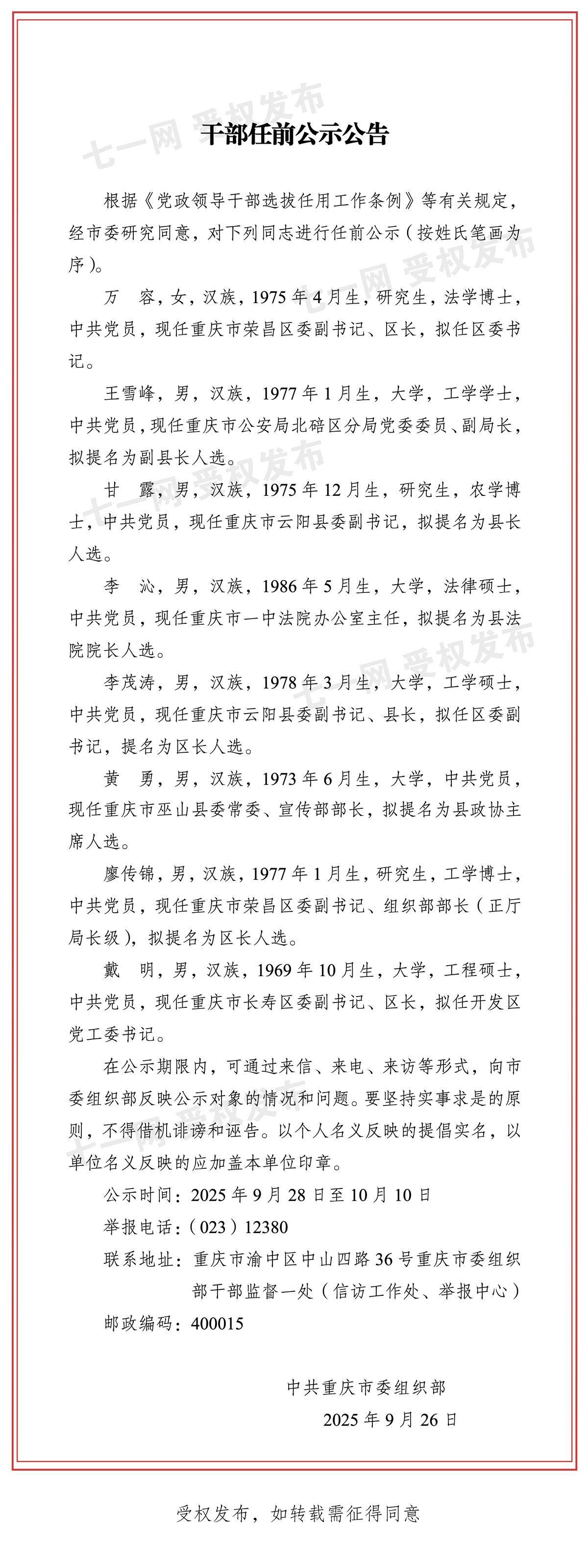 9月26日晚,重庆市委组织部发布干部任前公示公告,经市委研究同意,现任重庆市荣昌区委副书记、区长万容,拟任区委书记。
