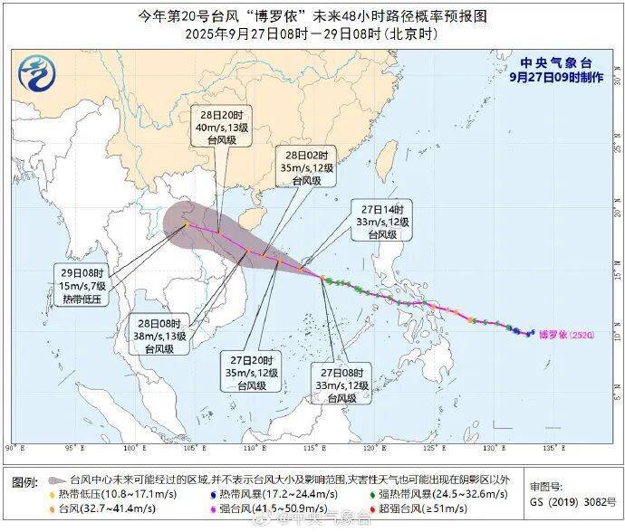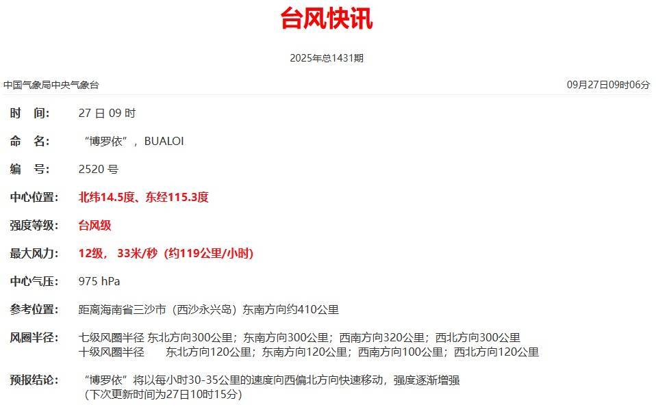 预计“博罗依”将以每小时30-35公里的速度向西偏北方向快速移动,强度逐渐增强。逐渐向海南岛以南海面靠近,并将于28日白天掠过上述海面,最强可达台风级(35-40米/秒,12-13级),以后将于28日傍晚到夜间在越南中北部沿海登陆。
