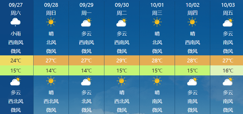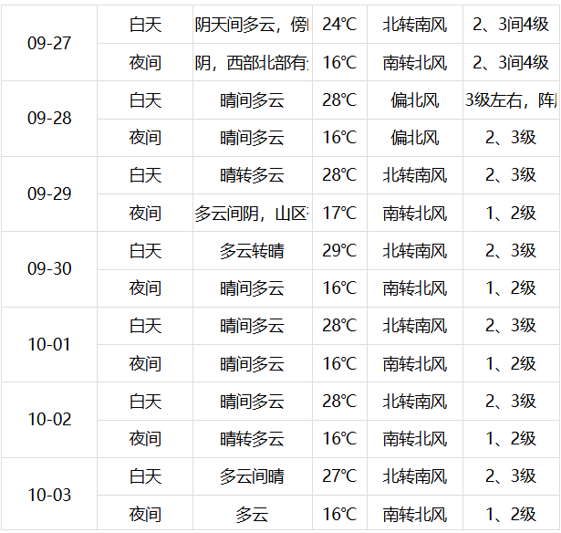 27 日(周六)下午:阴天间多云, 傍晚西部北部有分散性阵雨;北转南风 2、3 间 4 级;平原地区最高气温 24℃,山区最高气温 21~24℃;最小相对湿度 50%。