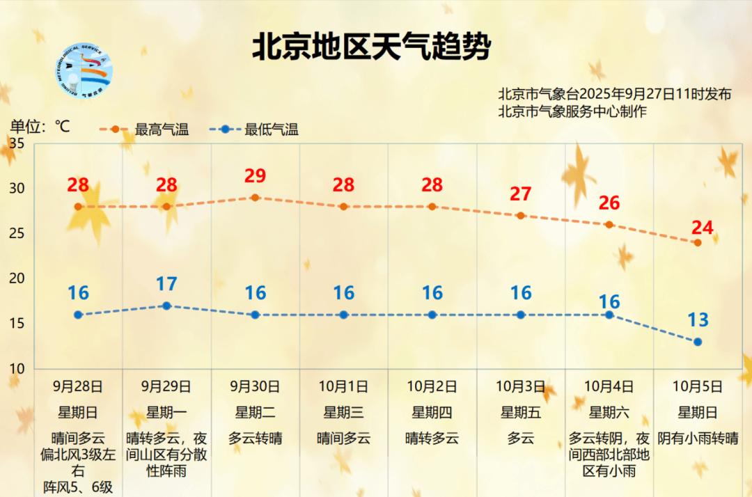 28 日夜间:晴间多云;偏北风 2、3 级;平原地区最低气温 16℃,山区最低气温 12~14℃。