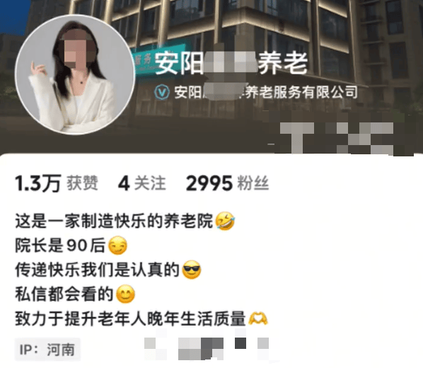 该养老院社交账号简介上写着:这是一家制造快乐的养老院,院长是“90 后”,传递快乐我们是认真的,私信都会看的,致力于提升老年人晚年生活质量。