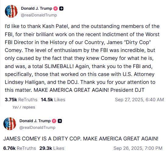 十几个小时后,也许依然意难平,特朗普又发一篇长帖文,把科米形容为“肮脏警察”,“他曾经是、如今还是个彻头彻尾的卑鄙小人”。特朗普同时对现任联邦调查局局长帕特尔的工作表示肯定,并对负责处理本案的相关人员表达感谢。