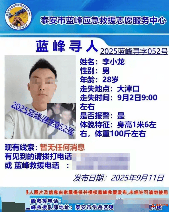 9月11日,泰安一支民间救援队9月11日发布的寻人启事显示。