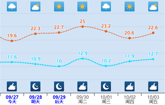 全市晴天,最低气温6~12℃,最高气温20~25℃。