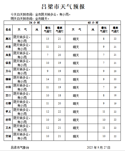 全市阴天转多云,有小雨,最低气温7~14℃,最高气温18~22℃。