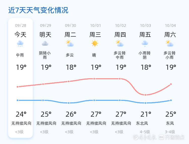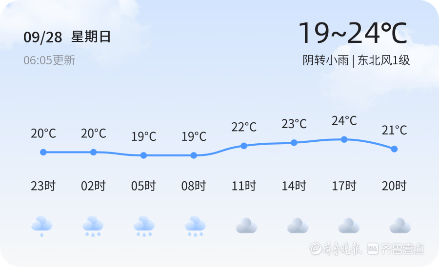 今天是9月28日,星期日,农历八月初七。日照市今日天气阴转小雨,气温在19℃至24℃之间,东北风1级,空气湿度为94%,PM2.5指数为14。全市各区均出现阴雨天气,市民出行需携带雨具,注意防寒保暖。