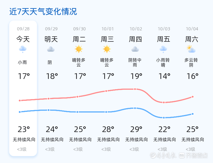 未来三天,淄博市天气趋势以阴雨为主。10月1日气温将上升至28℃,但随后两天将迎来阴转中雨天气,气温有所下降。市民需注意天气变化,适时增减衣物,出行时请携带雨具,注意交通安全。