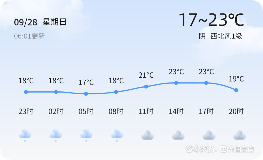 今天是9月28日,星期日,农历八月初七。淄博市今天天气以阴为主,气温在17℃到23℃之间,西北风1级,空气湿度高达99%,PM2.5指数为35,空气质量良好。各区县天气情况基本一致,阴天为主,风力较小,体感较为舒适。