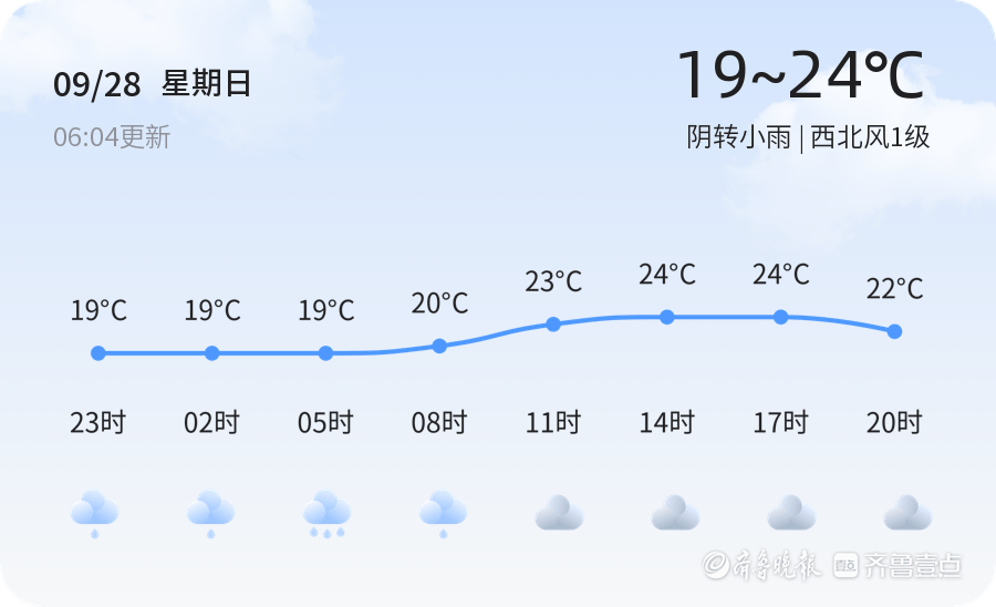 今天是2025年9月28日,农历八月初七,星期日。济宁市今日天气为阴转小雨,气温在19℃至24℃之间,西北风1级,空气湿度为96%。PM2.5指数为18,属于优级,空气质量良好。市民今日出行请注意携带雨具,雨天路滑,驾驶车辆时请保持车距,减速慢行,确保行车安全。