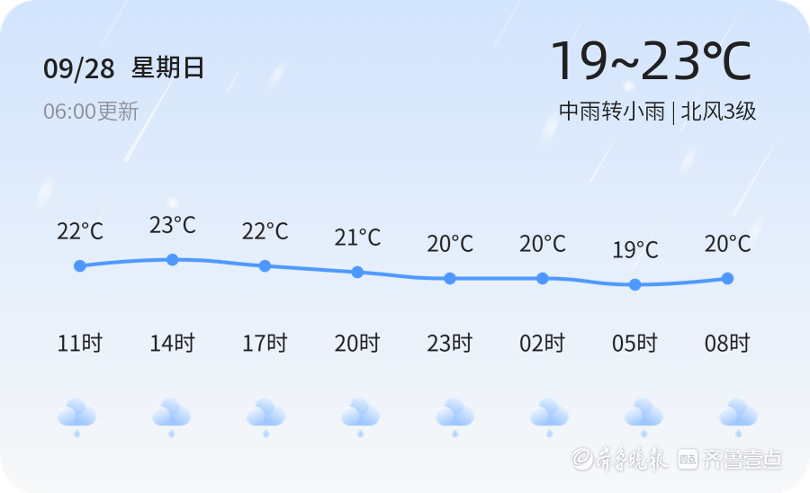 今天是2025年9月28日,农历八月初七,青岛市迎来中雨转小雨天气,气温介于19℃至23℃之间,北风3级,空气湿度为100%,PM2.5浓度为25,空气质量状况为良好。目前青岛市部分地区已出现雷电活动,并伴有短时强降水和7~9级雷雨大风。请市民朋友们注意防范,出行时携带雨具,减速慢行,确保行车安全。今天的天气对户外活动有一定影响,建议市民尽量减少不必要的外出,确需外出时注意防雨防风。