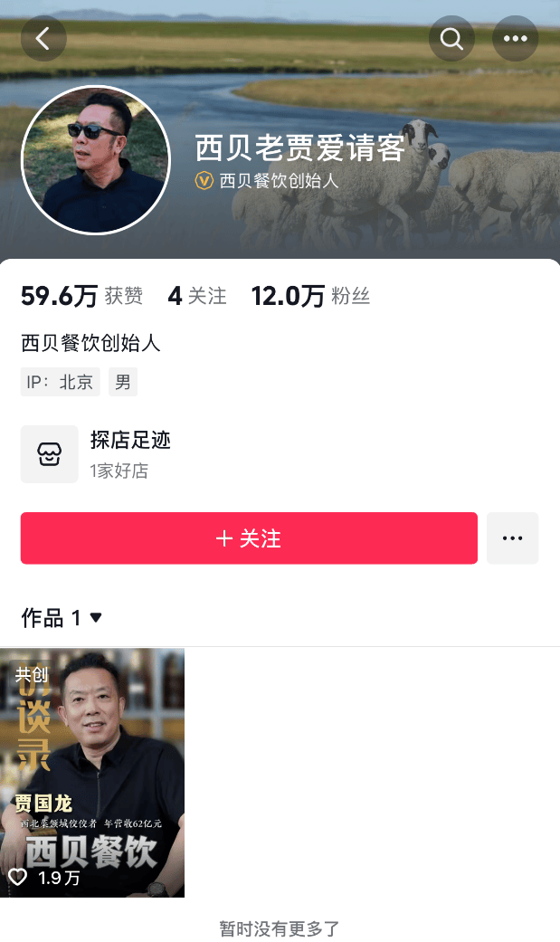 9月28日,记者搜索发现,西贝餐饮创始人贾国龙的抖音目前仅保留一条公开视频作品,发布于2024年9月30日,该视频为“大熊专访贾国龙”,涉及西贝餐饮成长史,称西贝是西北菜领域佼佼者、年营收达62亿。