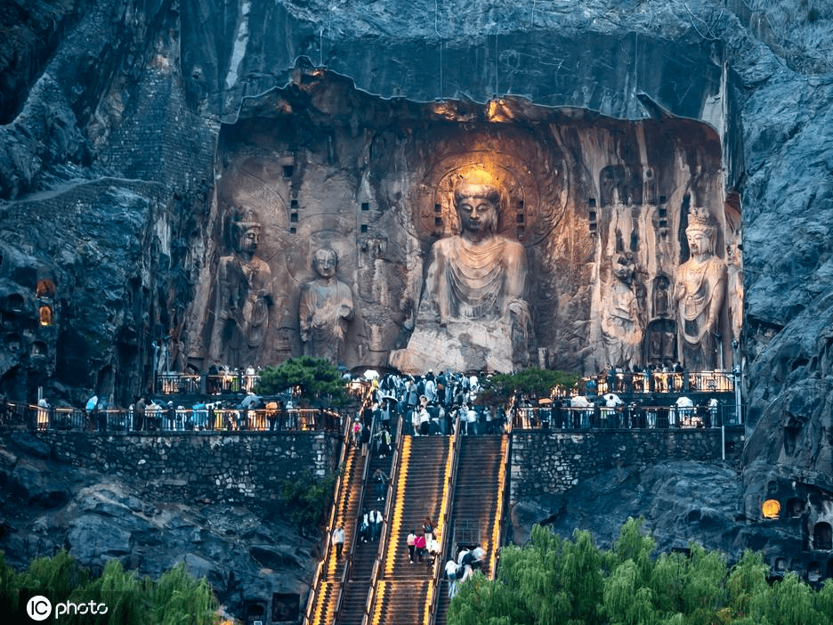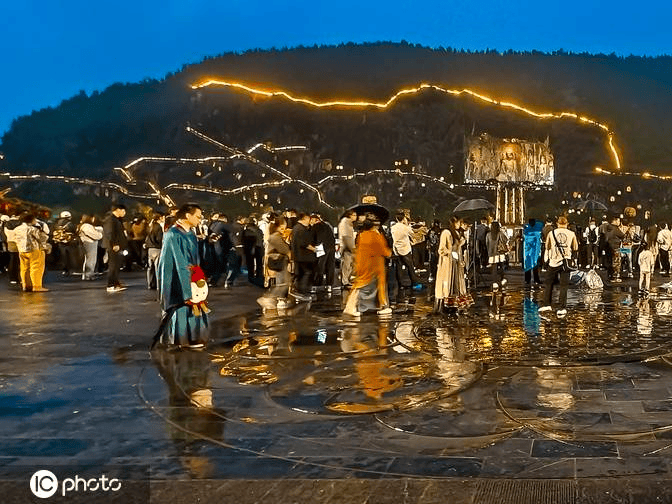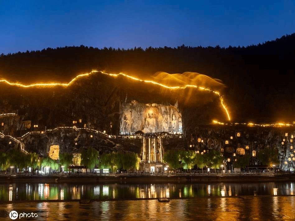 当最后一缕天光隐入伊河,龙门西山突然被点亮。卢舍那大佛的眉间白毫灯率先苏醒,像一枚被历史摩挲千年的舍利子,在夜色中浮出水面。