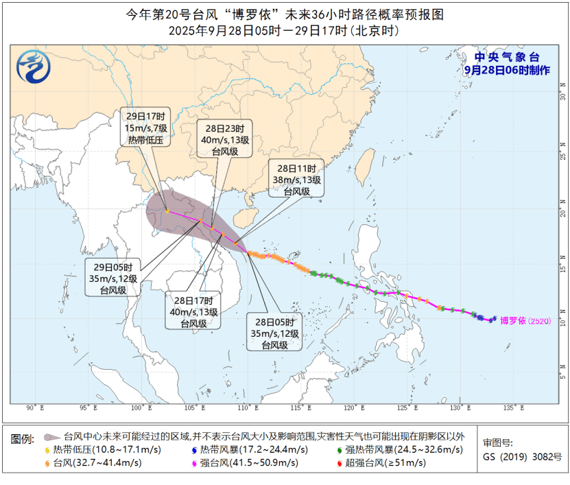 中央气象台9月28日10时继续发布 台风黄色预警:预计“博罗依”将以每小时20-25公里的速度向西北方向移动,强度还将有所加强, 将于28日下午掠过海南岛以南海面,逐渐向越南中北部沿海靠近,28日夜间至29日早晨以台风级或强台风级在越南中北部沿海登陆,尔后逐渐减弱。