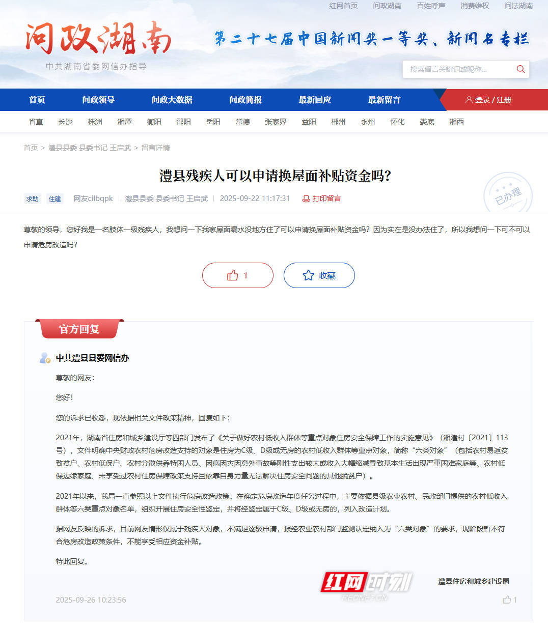 红网时刻新闻9月28日讯(记者 李丽)近日,网友“cilbqpk”在红网《问政湖南》栏目留言咨询,作为一名肢体一级残疾人,家中屋面漏水是否可以申请危房改造?澧县住房和城乡建设局回应称:目前网友情形仅属于残疾人对象,不满足逐级申请,报经农业农村部门监测认定纳入为“六类对象”的要求,现阶段暂不符合危房改造政策条件,不能享受相应资金补贴。