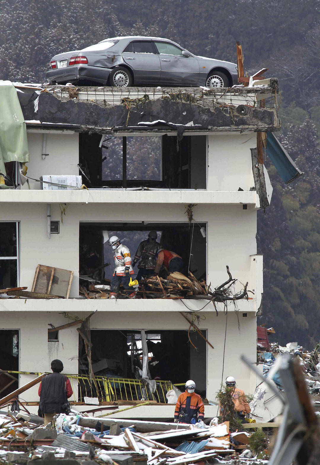 ▲当地时间2011年3月16日,日本北部南三陆町,消防员搜寻失踪人员。图据视觉中国