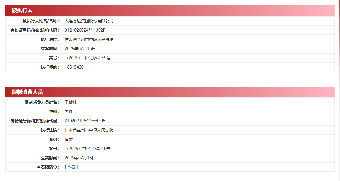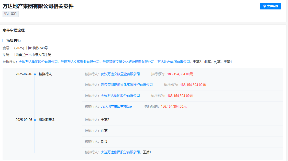 红星资本局通过天眼查App查询发现,相关案件执行标的为1.86亿元,执行法院为甘肃省兰州市中级人民法院,发布时期为9月26日,被执行人涉及武汉万达文旅置业有限公司、武汉楚河汉街文化旅游投资有限公司、大连万达集团股份有限公司、万达地产集团有限公司。