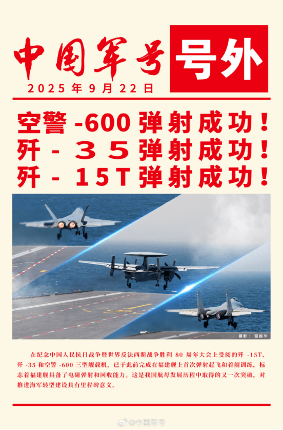 托养鸡老爷的福,笔者此前已了解到“福建”舰早在第七次海试期间就完成了弹射。但当这一天真的来临,笔者从手机上看见18舰的电磁弹射装置将飞机以反直觉的加速度放飞海鹫之时,激动之情仍难以言表。无论是《攻坚》专题片戛然而止的弹射画面,还是央视军事就弹射起降“明知故问”的一次次刺挠,军迷属实被活活“折磨”了两个多月。而在长春航展后劲儿刚过、国庆假期尚未到来的9月22日,“福建”舰的弹射画面可谓是“压抑到极致的极致爆发”,一鸣惊人,让大伙提前过了个好节。9月22日确实是个好的日子。