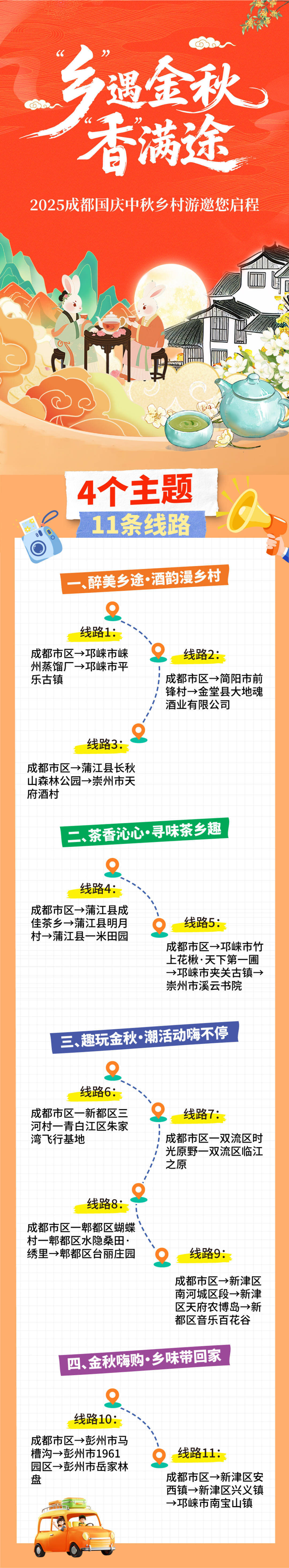 据了解,今年以来,成都市农业农村局聚焦创新和美乡村乐享场景,围绕端午节、暑期消夏、丰收节、国庆中秋假期的主题,已接连推出了50余条精品线路。未来,成都还将创新发展“农事+研学”“酒肆+演艺”“乡村+赛事”“院落+戏剧”“林盘+旅拍”等融合场景,争取建设更多中国美丽乡村休闲旅游行精品景点线路,为全国乡村振兴提供更多“成都实践”。