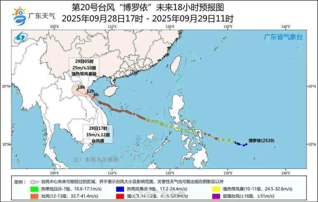 预计“博罗依”将于28日夜间至29日早晨以台风级(12-13级)在越南中北部沿海登陆,而后逐渐减弱。