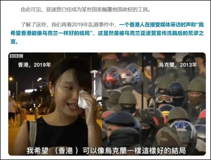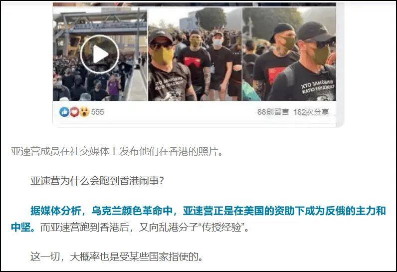 文中指明,乌克兰纳粹组织“亚速营”祸乱我国香港特区,是受“某些国家”指使的。