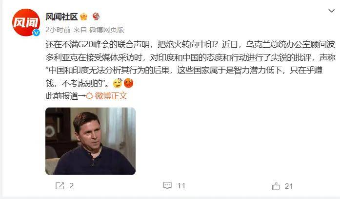 比如在2022年,乌克兰总统办公室主任波多利亚克在社交平台上发表推文:“给中国一个“加入文明世界”的机会”。2023年4月,他又公然叫嚣称中国必须做出选择,要么在国际法规定的框架内运作,然后完全取代俄罗斯;要么继续袖手旁观,然后逐渐失去其影响力,包括经济影响力。2023年9月,他还公然对中国搞种族歧视,叫嚣中印两国“智力潜力很低”。