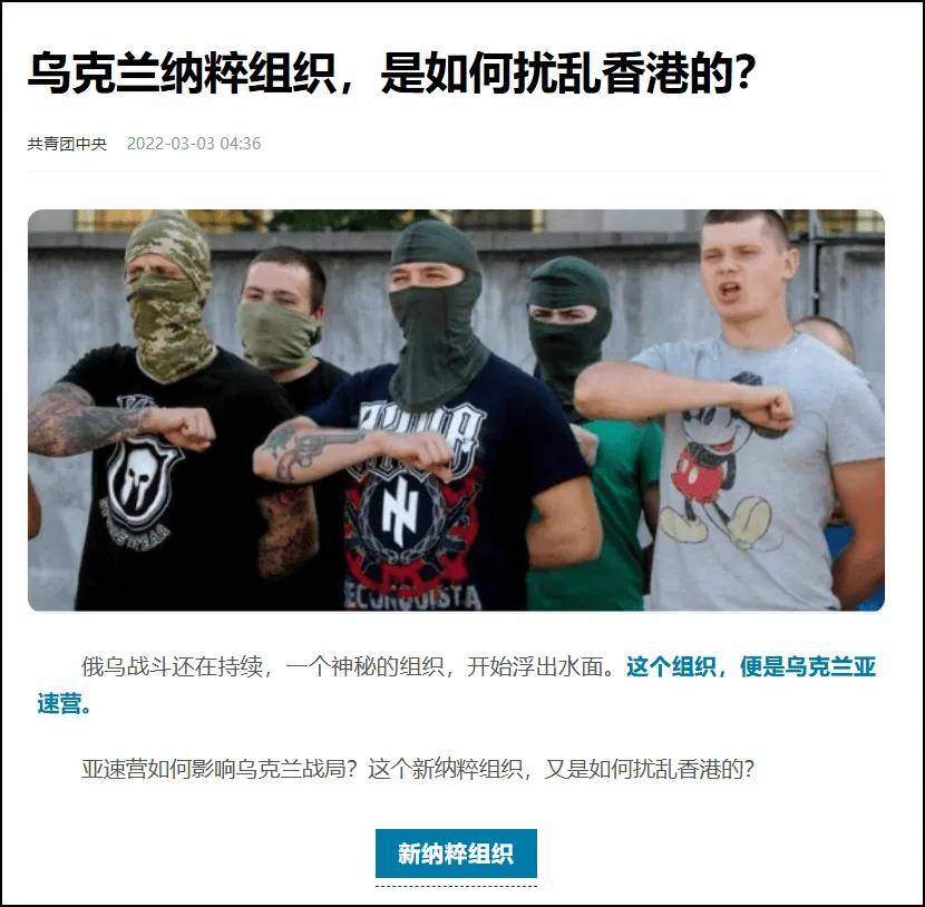 2022年3月3日,共青团中央曾发长文《乌克兰纳粹组织,是如何扰乱香港的?》,予以深度揭批。