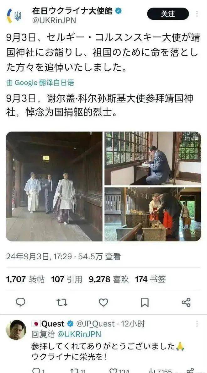 2024年9月3日是中国人民抗日战争暨世界反法西斯战争胜利79周年的纪念日,中方举行了隆重的纪念活动。可就在这同一天,乌克兰却践踏中方底线,其驻日大使谢尔盖·科森斯基去参拜日本的靖国神社,即乌克兰刻意选择这一天拜鬼,是典型的蓄意挑衅,是对中国人民的恶意侮辱。