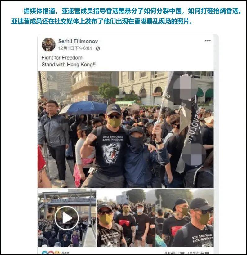 团中央明确指出:“亚速营成员指导香港黑暴分子如何分裂中国,如何打砸抢烧香港。亚速营成员还在社交媒体上发布了他们出现在香港暴乱现场的照片。”