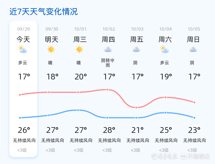 今天是9月29日,星期一,农历八月初八。济南市今天天气多云转晴,气温在17℃到26℃之间,东风2级,空气湿度96%,PM2.5指数为54。各区天气情况基本一致,整体以多云转晴为主,市民朋友们可以感受到秋日的温暖阳光。明天济南市天气晴朗,气温稍有上升,预计最高气温为27℃,最低气温为18℃,风力依旧较小,以无持续风向为主。与今天相比,明天的天气更加晴朗,适合市民朋友们外出活动。未来三天,济南市天气以晴到多云为主,气温波动不大,最高气温维持在27℃左右,最低气温在17℃到20℃之间。周四将迎来一次阴转中雨的天气过程,市民朋友们请注意携带雨具,出行时注意安全。温馨提示