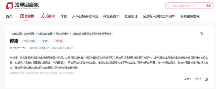 近日,有网友通过人民网“领导留言板”留言,反映从鄂尔多斯市鄂托克旗棋盘井镇苏米图村到杭锦旗伊和乌素脑高岱嘎查黑龙贵有一段约9公里的土路,坑洼不平,雨季时积水严重,影响车辆正常通行和行人安全。