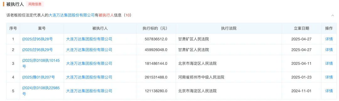 此外,万达商管也有1条被执行人信息,累计被执行总金额约295.9万元;万达地产集团有限公司有423条被执行人信息,被执行总金额共计18.4亿元,其中失信被执行人共4条,涉案总金额211.51万元。