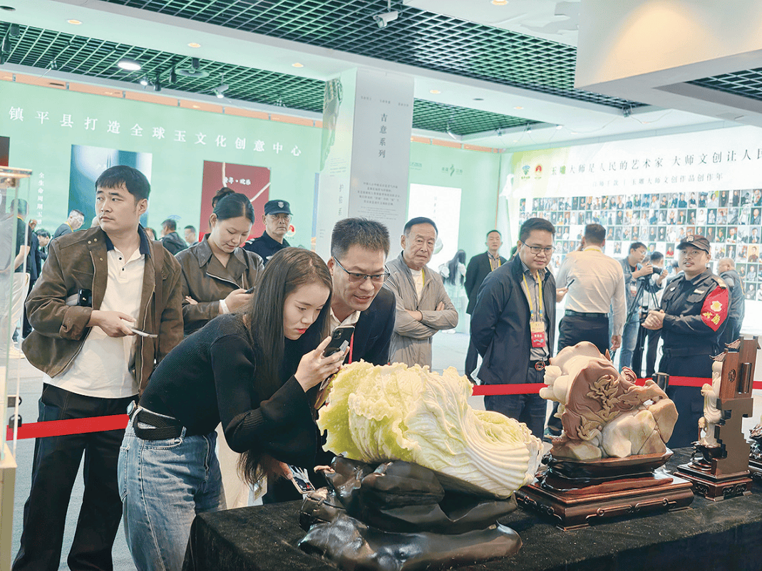 “雕刻技艺太精湛了,从线条到造型,每件作品都能看出创作者的用心!”刚看完一组和田玉摆件的游客王钢,语气里满是由衷的赞叹。另一边,驻足在翡翠展区的游客李芬也难掩喜爱:“整个展厅都被玉雕文化的艺术氛围填满了,我尤其喜欢那件白菜造型的玉雕,叶脉纹路栩栩如生,看了好一会儿都舍不得走,真想把这份精致带回家!”