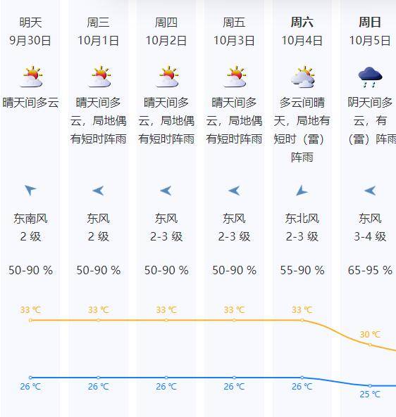 节前至假期前期(9月29日-10月4日),晴天间多云,白天炎热,局地偶有短时(雷)阵雨,最高气温33-35℃。假期中后期(10月5-6日),阴天间多云,多(雷)阵雨,部分时间降雨频密。假期后期(10月7-8日),多云到晴天,局地偶有短时阵雨,早晨最低气温24℃左右。