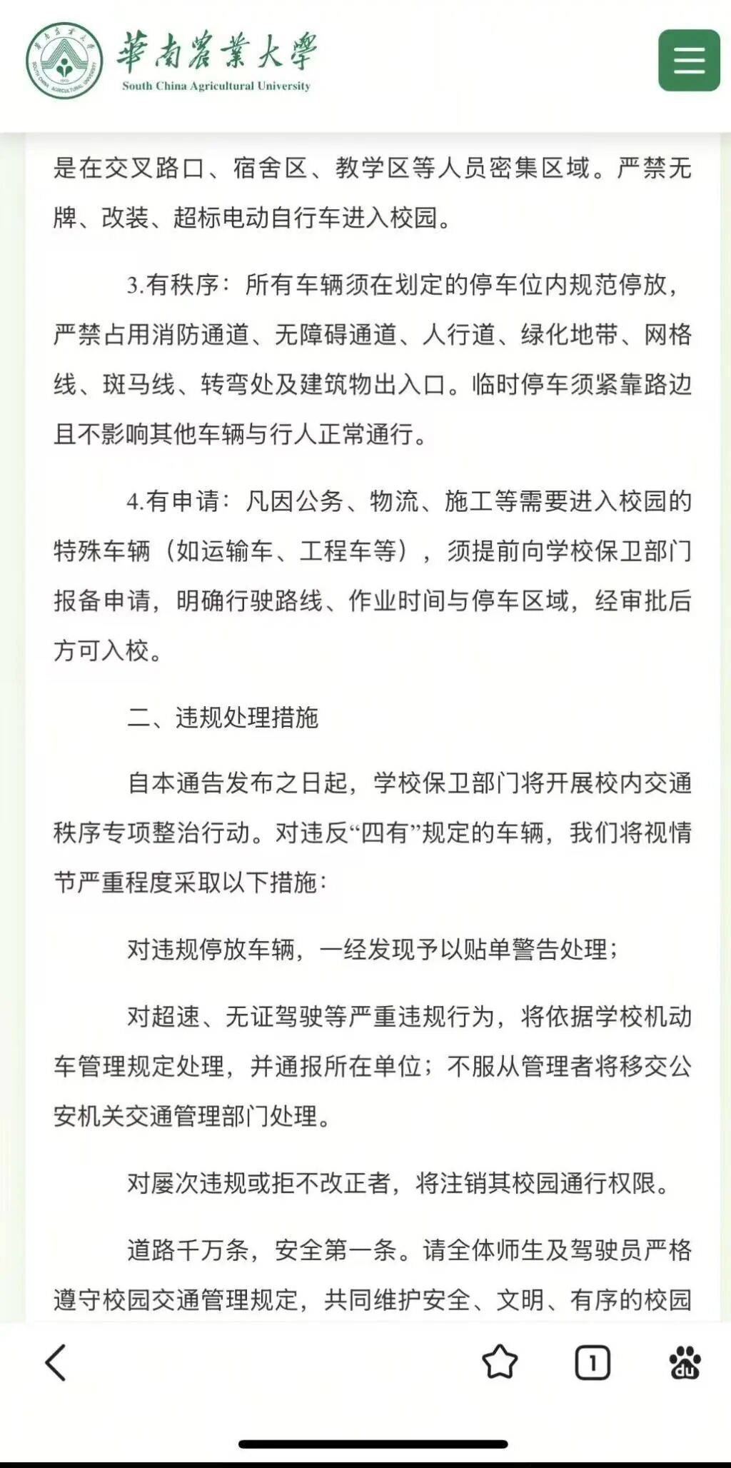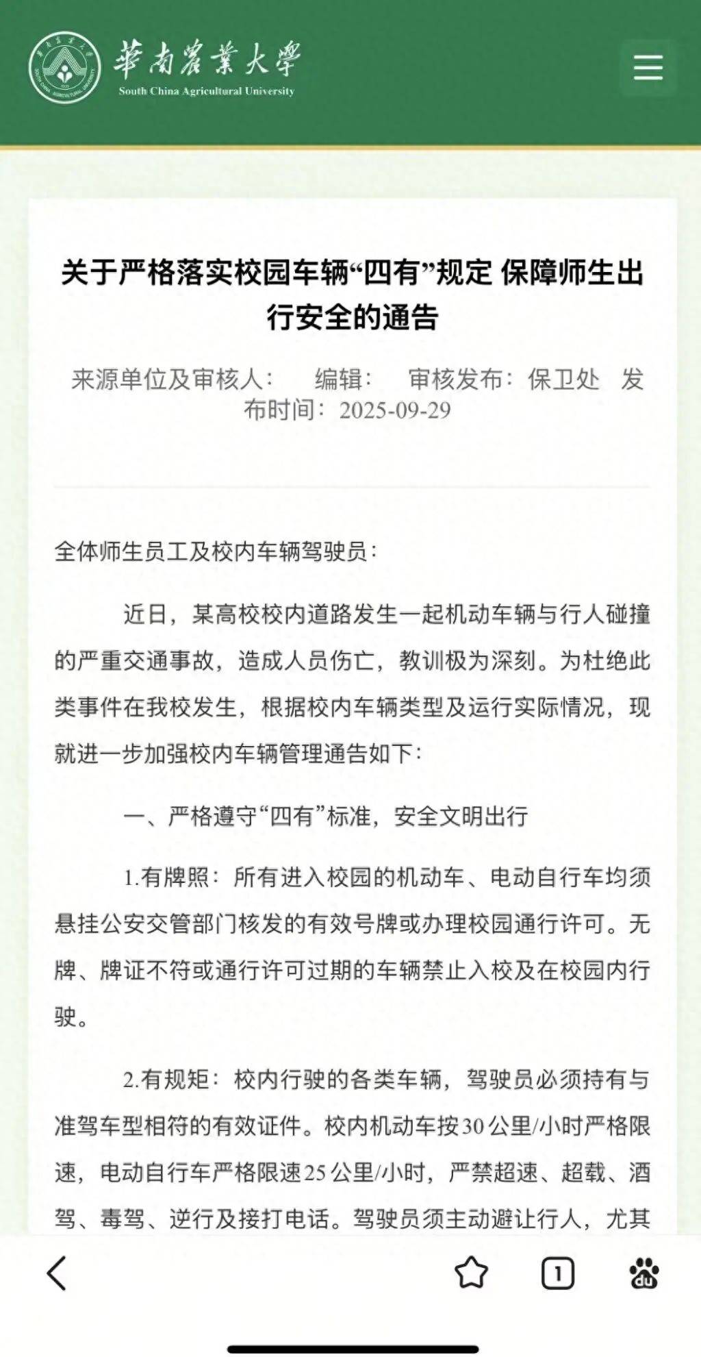 据华南农业大学官网消息,9月29日,华南农业大学保卫处发布《关于严格落实校园车辆“四有”规定保障师生出行安全的通告》(以下简称《通告》)称,近日,某高校校内道路发生一起机动车辆与行人碰撞的严重交通事故,造成人员伤亡,教训极为深刻。为杜绝此类事件在该校发生,根据校内车辆类型及运行实际情况,现就进一步加强校内车辆管理通告。