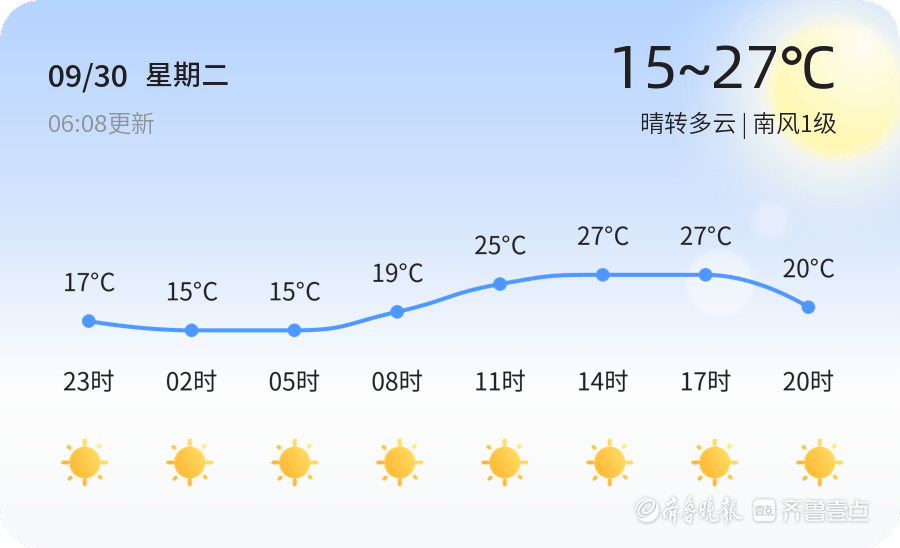 今天是9月30日,农历八月初九,德州迎来晴转多云的天气。今天的气温范围在15℃至27℃之间,南风1级,空气湿度为96%,PM2.5指数为72。全市各区天气情况总体稳定,以晴转多云为主,适合市民外出活动。