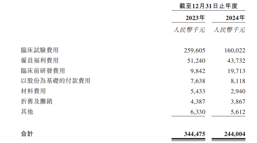 或许是因为上市计划一直不太顺利,药捷安康在“花钱”方面有所收敛。2024年,公司研发费用为2.44亿元,较23年减少了1个亿,其中临床试验费用就少了近4成。今年上半年,研发费用进一步下降到9840万元,较去年同期减少30.9%。