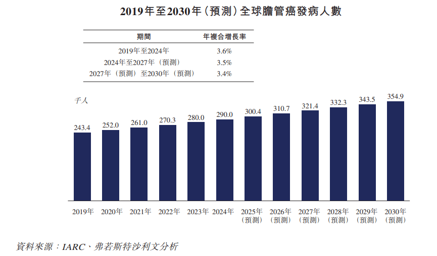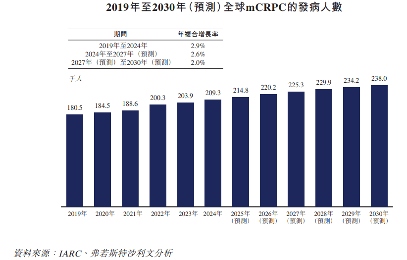 相较于其他常见癌症,上述两个癌症发病率较低。根据弗若斯特沙利文的资料,2024年全球CCA发病人数为29.0万人,mCRPC发病人数为20.9万人,预计2027年将分别增加至32.1万人、22.5万人。