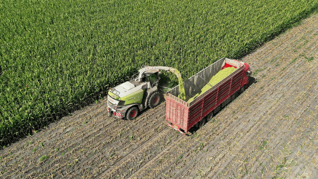 哈尔滨市双城区,收割机正沿着田垄匀速前行,锋利的收割台将青贮玉米整齐收割,经过粉碎、输送,源源不断地装入转运机车中,整个作业流程连贯高效。