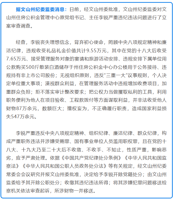 据顶端新闻报道,9月29日下午,记者联系到文山州纪委宣传部,工作人员称,下午,官方刚通报了李锐严重违法违纪被开除党籍和公职的全文,“之前网上热议的仅是他违反中央八项规定的具体表现,他还有其他违法行为”。