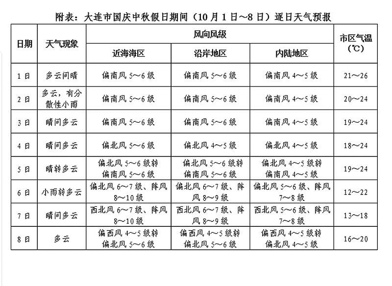 9月28日,大连市气象局发布重要气象报告:国庆中秋假日期间(10月1日~8日),我市以晴间多云天气为主。假日后期(10月6日~7日)有降雨、大风、降温过程。假日期间大部分时段适宜出行,需注意防范6日~7日的大风等天气对交通出行等的不利影响。另外,节前(9月30日)有阵雨并伴有强对流天气。