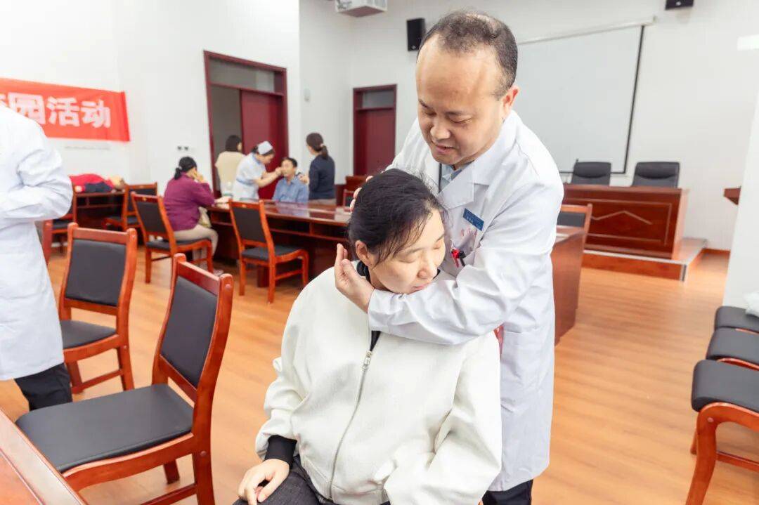 活动现场,中医适宜技术体验区人气火爆 。火龙罐温通经络、耳穴压豆调节压力、刮痧祛湿排毒、艾灸温阳止痛……医护人员边操作边讲解原理。一位体验火龙罐疗法的教师表示:“腰部酸胀感做完立即减轻,中医外治法太神奇了!”医护人员还针对教师普遍存在的肩颈问题,现场传授“米字操”、“颈椎放松操”等简易锻炼方法,帮助大家掌握日常保健技巧。