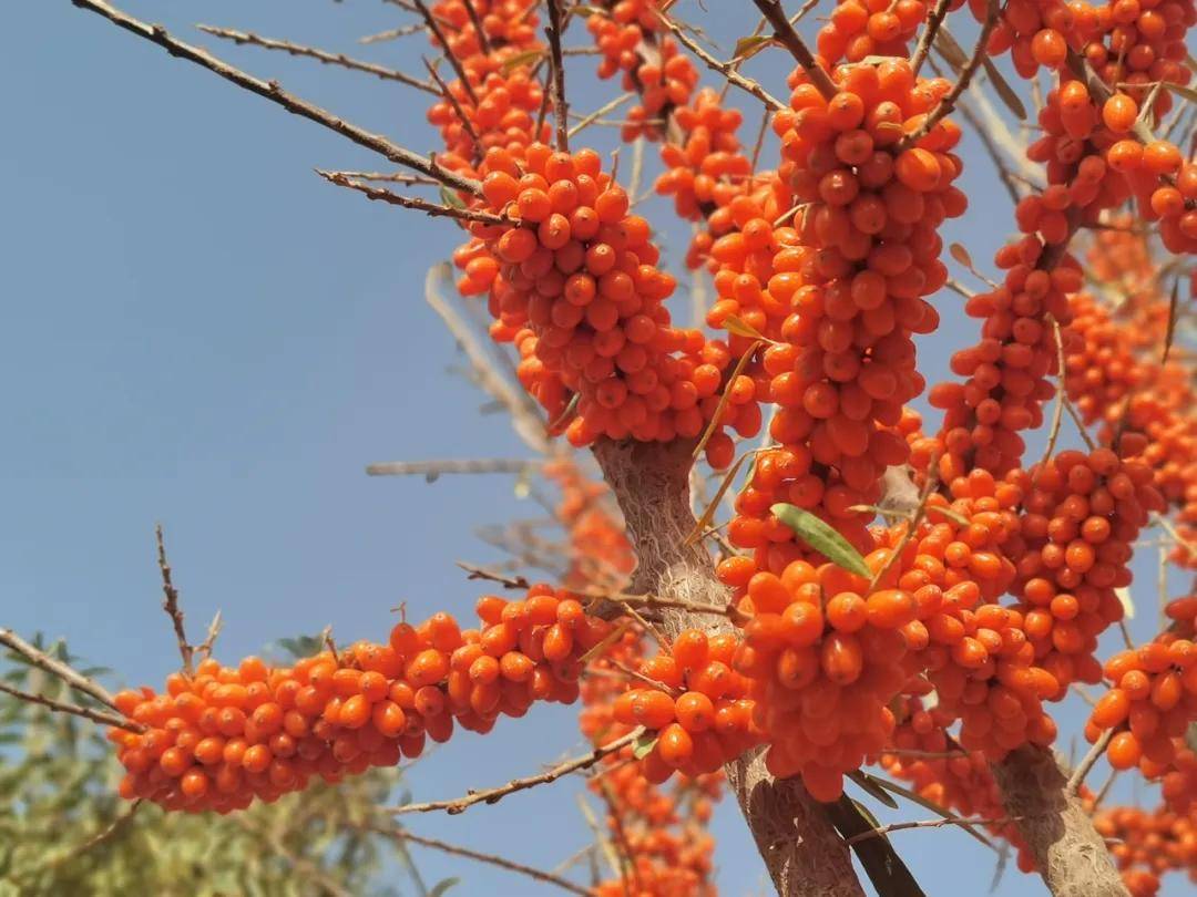 在桐安乡,沙棘果正书写着“绿了戈壁、富了百姓”的生态故事。走进桐安乡沙棘种植基地,连片的沙棘树上挂满了橙红色的果实,格外亮眼。当地群众正趁着晴好天气,争分夺秒地采收大果沙棘。新疆丝路盛世农业科技有限公司总经理赵振君说:“这几天,我们的沙棘果已经熟了,我们都已经开始陆续采摘。今年的产量还不错,一亩地在一千二百公斤左右。”泽普县依托沙棘耐旱、固沙的特性,在荒漠边缘发展沙棘种植4000亩,建立深加工工厂,开发出沙棘啤酒等产品,不仅延伸了产业链,更提高了产品的附加值。