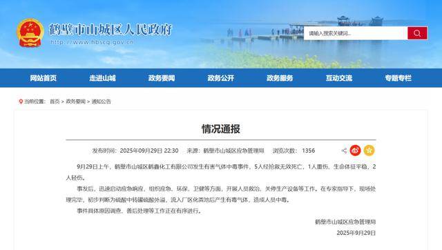 据通报内容,9月29日上午,鹤壁市山城区鹤鑫化工有限公司发生有害气体中毒事件,5人经抢救无效死亡,1人重伤、生命体征平稳,2人轻伤。