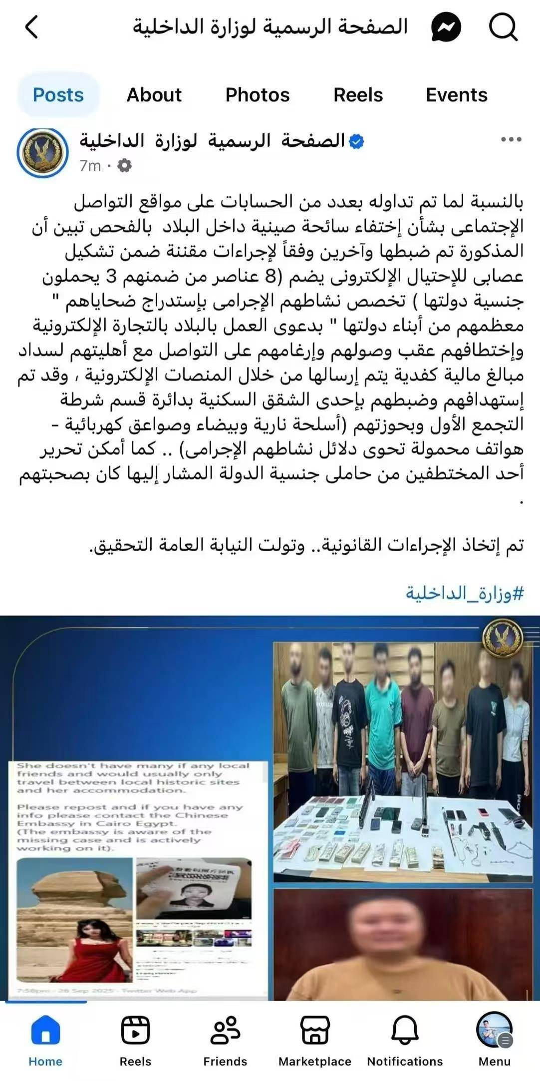 红星新闻报道称,据埃及内政部官方社交账号发布通报显示:关于部分社交媒体账号所传播的有关一名中国女游客在埃及境内失踪的消息。经调查核实,她与其他几人已被依法控制,因其隶属于一个专门从事电子诈骗的犯罪团伙(该团伙共8名成员)。该团伙的犯罪活动主要是以在埃及从事电子商务工作为名,诱骗受害者(大部分是其本国同胞),待其抵达后便实施绑架,并强迫他们与家人联系,以支付通过电子平台发送的赎金。警方已在其位于第一定居点警察分局辖区的一所住宅公寓内将他们锁定并逮捕,并查获了枪支、白刃武器、电击枪以及若干包含其犯罪活动证据的手机。同时,一名与她在一起的、上述国籍的被绑架者也已获救。
