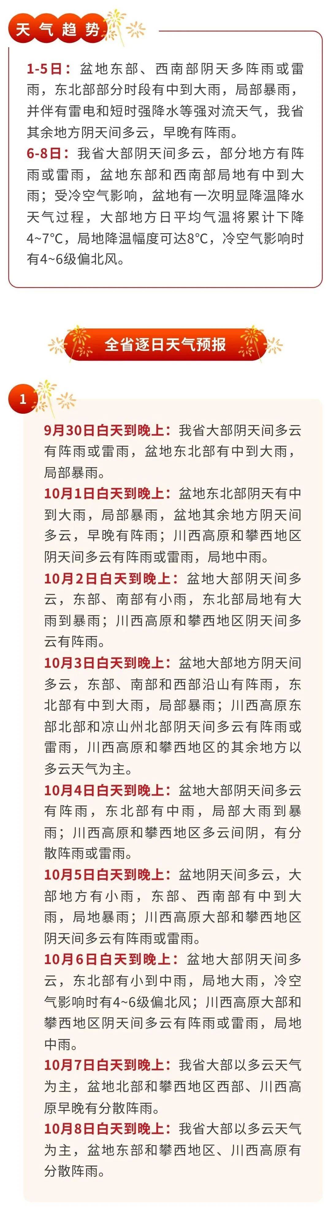 据中央气象台,10月1日至5日,华西至黄淮一带多降雨天气,主要影响地区包括四川、陕西、重庆、湖北、河南、山东、苏皖北部等地,上述地区累计降雨量40至80毫米,部分地区120至180毫米,四川东北部、陕西南部、重庆北部局地可超300毫米。其中,最强降雨时段为1至2日。
