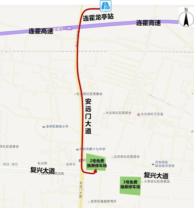 3号免费换乘停车场,位于连霍高速龙亭站向南2000米,安远门大道与复兴大道交口左转向东300米路南,提供小型车位2000个。从连霍高速龙亭站下站小型客车也可在此停放,乘坐免费换乘公交往返景区。