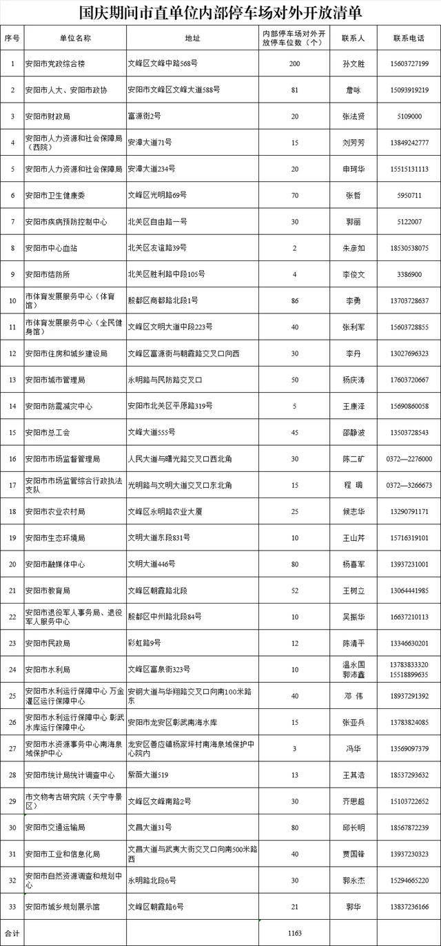 为服务保障2025年国庆假日期间外地来安游客和广大市民群众自驾出行车辆停放,安阳市城市管理局组织全市各有关行政机关、企事业单位、社会团体内部停车场免费对外开放。