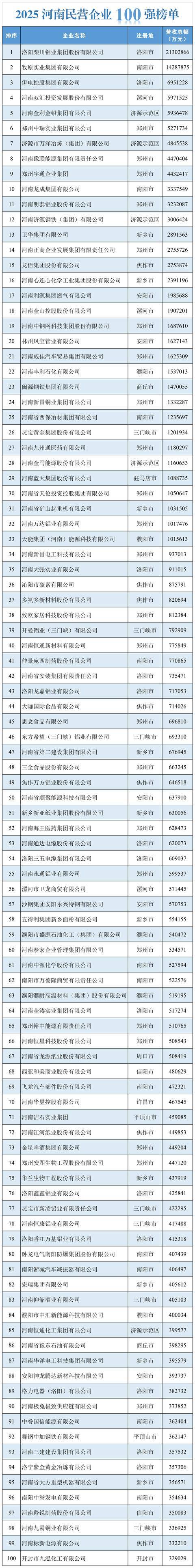 9月30日,河南省工商联发布2025河南民营企业100强榜单。其中洛阳栾川钼业集团股份有限公司、牧原实业集团有限公司、伊电控股集团有限公司位列榜单前三。