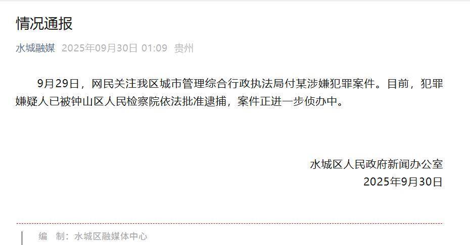 9月29日,多家媒体报道称,贵州省六盘水市水城区城管局副局长付某被指长期性侵继女,受害人父亲希望严惩付某。9月30日凌晨,水城区发布通报,针对付某涉嫌犯罪案件,犯罪嫌疑人已被钟山区人民检察院依法批准逮捕,案件正在进一步侦办中。